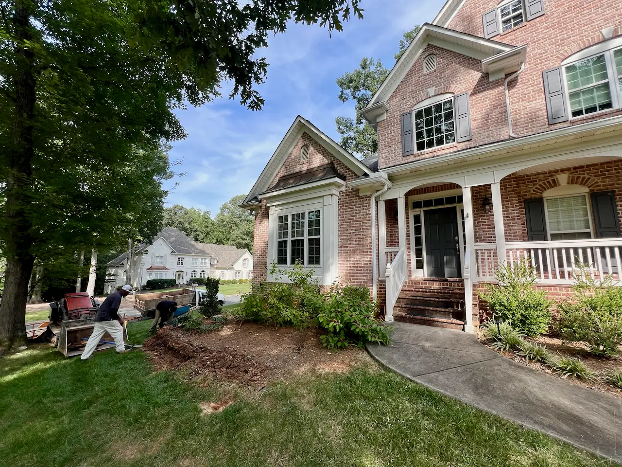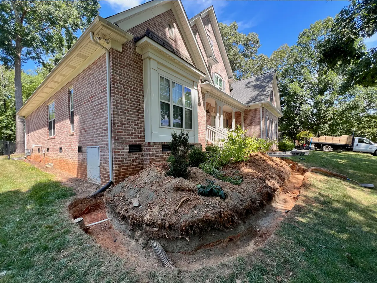 This home’s front foundation bed was sloped and beginning to wash out, limiting planting space and curb appeal. Our team installed a curved modular block retaining wall with a smooth capstone finish, creating a raised planting area that frames the house and stabilizes the grade. The new wall not only prevents erosion but also adds a polished, low-maintenance feature that enhances the home’s overall appearance.