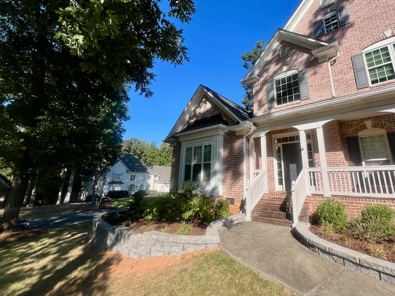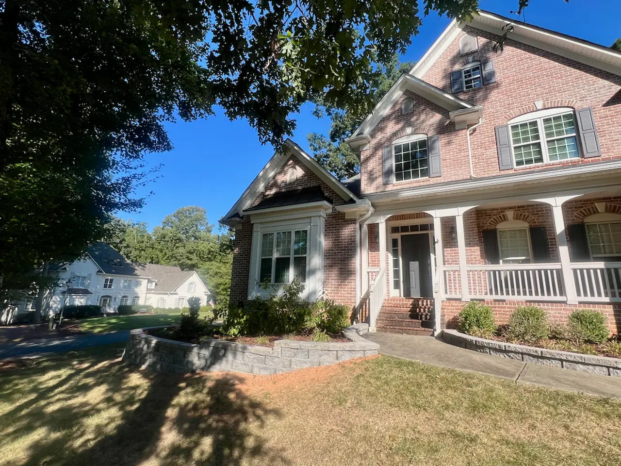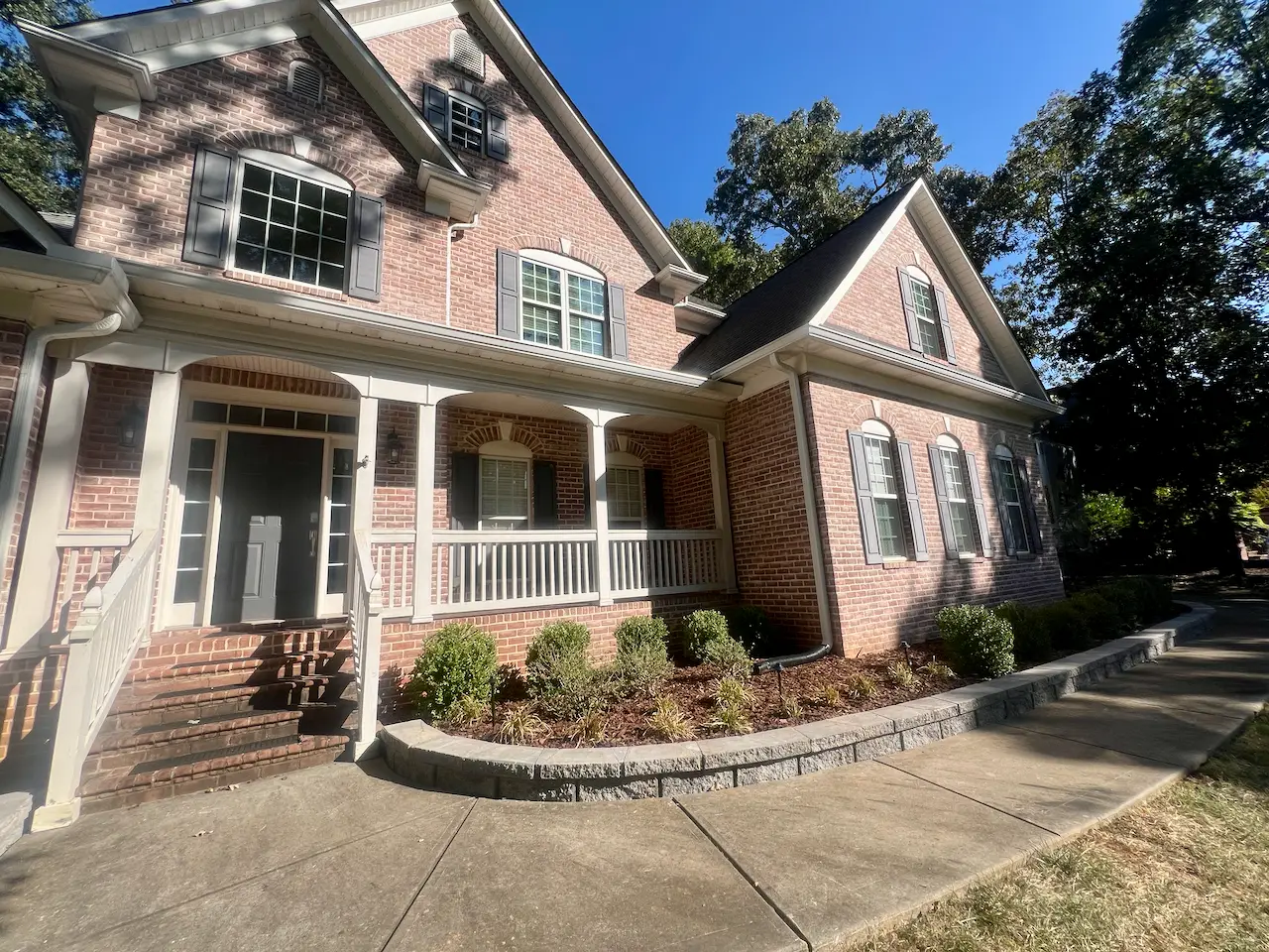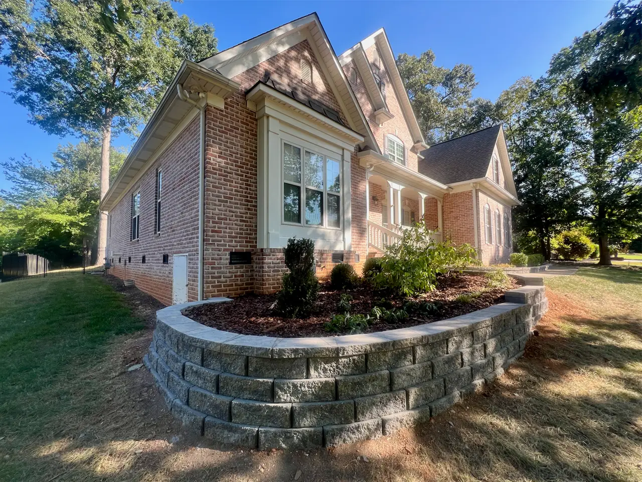 This home’s front foundation bed was sloped and beginning to wash out, limiting planting space and curb appeal. Our team installed a curved modular block retaining wall with a smooth capstone finish, creating a raised planting area that frames the house and stabilizes the grade. The new wall not only prevents erosion but also adds a polished, low-maintenance feature that enhances the home’s overall appearance.